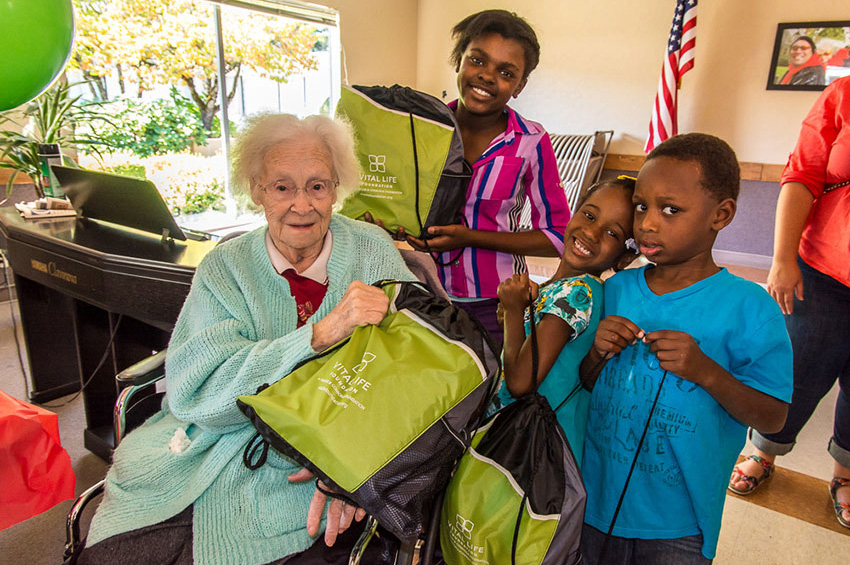 Since 2008, the Backpack to School program has provided essential support to families of K-6 children employed in senior care communities. This program has distributed over 25,000+ backpacks fully packed with supplies, across 14+ states, with the support of 100+ senior care campuses and business collaborators.